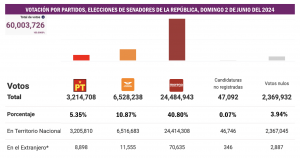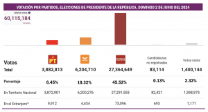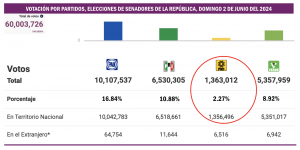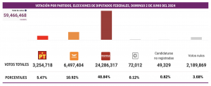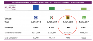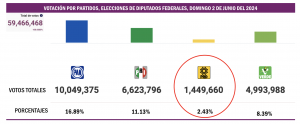 En los comicios del 2024, no alcanzó el 3 por ciento de la votación en alguna de las tres elecciones que se llevaron a cabo el pasado domingo 2 de junio: tuvo el 1.86 por ciento en la contienda presidencial; 2.27 por ciento en la disputa para Senadores y 2.43 por ciento en los comicios para diputados federales.