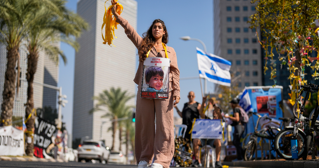 Una mujer, con la fotografía de un niño que fue tomado como rehén durante el ataque sin precedentes de Hamás en Israel, entrega listones amarillos a los automovilistas en el centro de Tel Aviv. Foto: Francisco Seco, AP