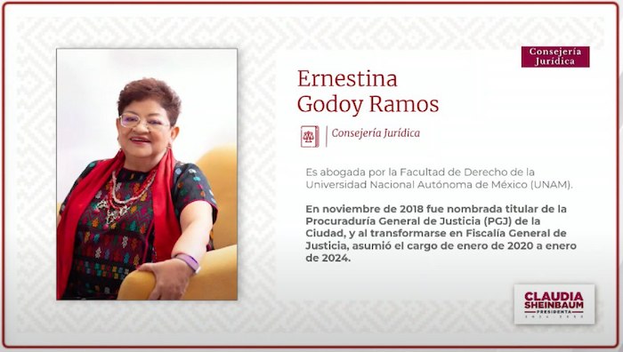 La Senadora electa y exfiscal de la Ciudad de México, Ernestina Godoy Ramos, será la Consejera Jurídica de la Presidencia. "Erestina es quizá la mejor Fiscal que haya habido en nuestro país, no solamente como Fiscal estatal, no sólo en apoyo a las mujeres, en contra de la corrupción y también gracias a ella se lograron los índices de disminución en la impunidad en la Ciudad de México".