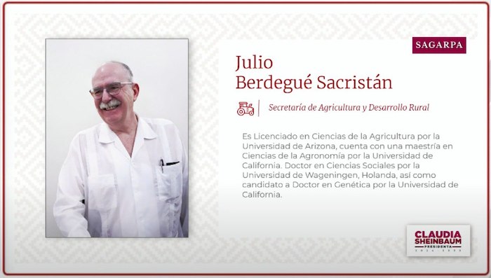 Julio Berdegué Sacristán estará al frente de la Secretaría de Agricultura. Berdegué participó en Diálogos por la Transformación, coordinando el eje de desarrollo rural y soberanía alimentaria. Berdegué fungió hasta agosto de 2022 como subdirector general y representante general de la FAO de Naciones Unidas, para América Latina y el Caribe.