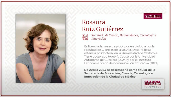 Claudia Sheinbaum anunció que Rosaura Ruiz Gutiérrez será la titular de una nueva dependencia: la Secretaría de Ciencia, Humanidades, Tecnología e Innovación, la cual tomará el lugar del Consejo Nacional de Humanidades, Ciencias y Tecnologías (Conahcyt). Rosaura Ruiz ya ha trabajado con Claudia Sheinbaum: de 2018 a 2023 se desempeño como titular de la Secretaría de Educación, Ciencia, Tecnología e Innovación de la Ciudad de México.