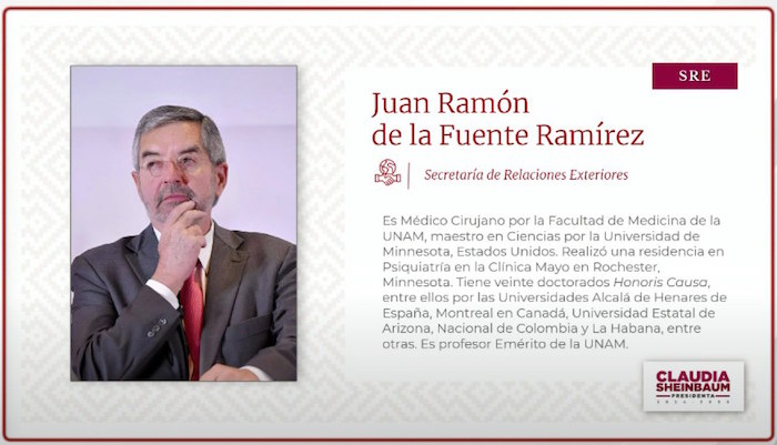 Juan Ramón de la Fuente, quien actualmente se desempeña como el coordinador de la transición, será quien ocupe la Secretaría de Relaciones Exteriores. Entre 2018 y 2023, fue Embajador de México ante la ONU, además de haber sido rector de la UNAM entre 1999 Y 2007.