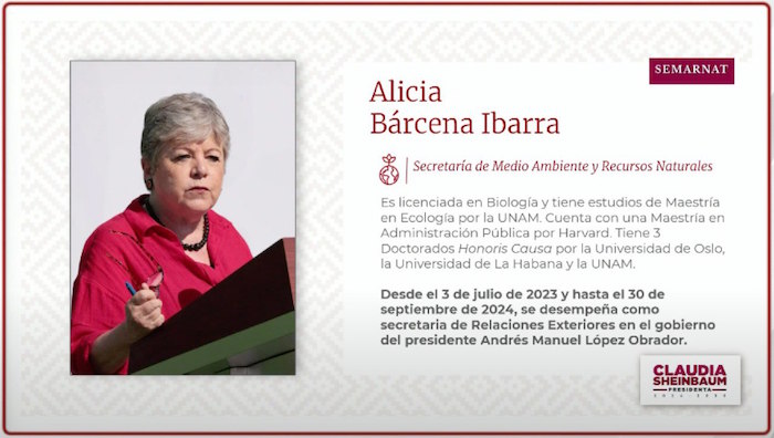La actual Canciller Alicia Bárcena ocupará la Secretaria de Medio Ambiente y Recursos Naturales. "Ella es licenciada en Biología, su origen es justamente los temas ambientales. Tiene estudios de Maestría en Ecología por la UNAM", expresó Sheinbaum.