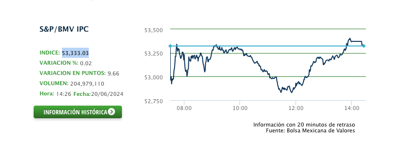 En México, el Índice de Precios y Cotizaciones (IPC), que se conforma por las 35 empresas más importantes del mercado mexicano listadas en la Bolsa Mexicana de Valores, se ubicó en 53 mil 333.03 puntos, una ganancia de 0.02 por ciento.