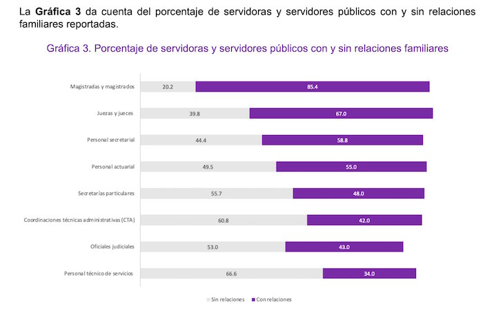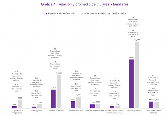 Hay datos de las y los magistrados, quienes en 2022 tenían en promedio a 4 familiares trabajando en el CJF; también se identificaron a 16 titulares que contaban con más 13 familiares y el tope en un caso fue de 23. En cuestión de género, las categorías de magistradas, magistrados, juezas, jueces y personal secretarial reportaron que hay 10 por ciento más de hombres que tienen relaciones familiares con el personal.