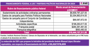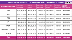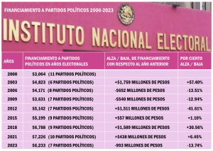 En 2024, los siete partidos políticos nacionales con registro gastarán 14 mil 444 millones de pesos. Un incremento del 53.85 por ciento con respecto al monto de financiamiento que recibieron en 2018, cuando se llevaron a cabo las anteriores elecciones presidenciales. En los años de alternancia, desde el 2000 al 2024, el presupuesto de los partidos políticos ha crecido un 240 por ciento, de 3 mil 64 millones en el año 2000, a 10 mil 444 millones en el 2024.