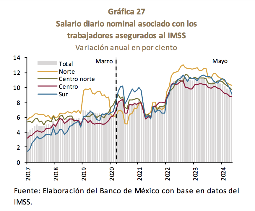 En cuanto al salario, durante el primer trimestre del año el sueldo diario promedio de trabajadores asegurados en el IMSS presentó un incremento anual de 10.1 por ciento a nivel nacional. Para mayo, el norte y centro norte fueron las regiones que presentaron el mayor crecimiento anual en ese mes, en 10.3 y 9.7 por ciento, respectivamente, mientras que el sur y centro mostraron alzas anuales de 9.1 y 8.8 por ciento.