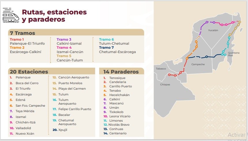 El Tren Maya, cuya primera etapa fue inaugurada el 15 de diciembre de 2023, recorre los estados de Chiapas, Campeche, Tabasco, Yucatán y Quintana Roo a través de siete tramos: