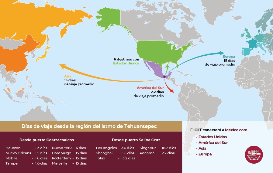Además, integra los puertos de Salina Cruz, Coatzacoalcos y Puerto Chiapas. Se tendrá acceso al sur de Estado Unidos, Europa, América y Asia, facilitando el intercambio comercial a nivel nacional e internacional.
