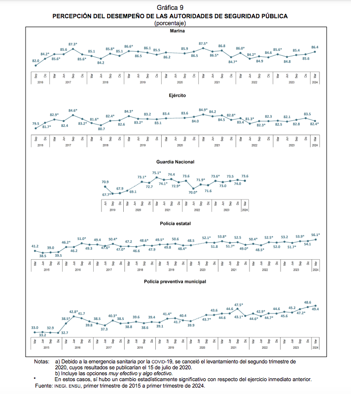 “Los porcentajes de la población de 18 años y más que identificaron a las diversas autoridades de seguridad pública y que percibieron su desempeño como muy o algo efectivo en sus labores para prevenir y combatir la delincuencia fueron: Marina, 86.4 por ciento; Ejército, 82.4 por ciento; Guardia Nacional, 73.6 por ciento; policía estatal, 56.1 por ciento; y policía preventiva municipal, 49.4 por ciento”, señala el documento publicado el pasado mes de abril.