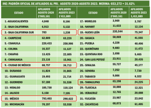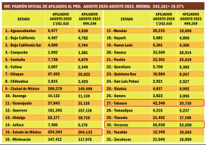 Si usted observa con cuidado el padrón de afiliados del Partido Revolucionario Institucional, notará que hubo algunas entidades en las cuales el derrumbe de su membresía fue brutal. Como es el caso del Estado de México, en donde pasó de 793 mil 403 afiliados a 298 mil 622 en unicamente tres años.