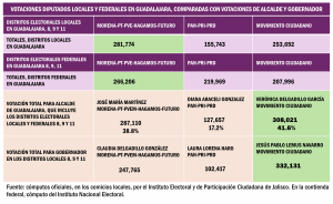 En el caso particular de Guadalajara, que tiene tres ditritos electorales, 8, 9 y 11, los mismos territorios y las mismas listas nominales de electores para las diputaciones locales y federales, Morena ganó en los distritos 9 y 11. La suma de votos de los candidatos de Movimiento Ciudadano en esos tres distritos no se acercaron a los 300 mil sufragios. Pero, curiosamente, en esas tres demarcaciones distritales, tanto la presunta candidata ganadora en Guadalajara, Verónica Delgadillo García y el presunto ganador de la gubernatura de Jalisco, Jesús Pablo Lemus Navarro, sí superon lo 300 mil votos. Un caso extrañísimo. Igual contrastó la suma de votos para los candidatos a senadores de Movimiento Ciudadano en esos tres distritos electorales de Guadalajara, donde no se aproximaron a los 200 mil sufragios, muy lejos de los más de 300 mil votos reconocidos a Delgadillo García y Lemus Navarro.