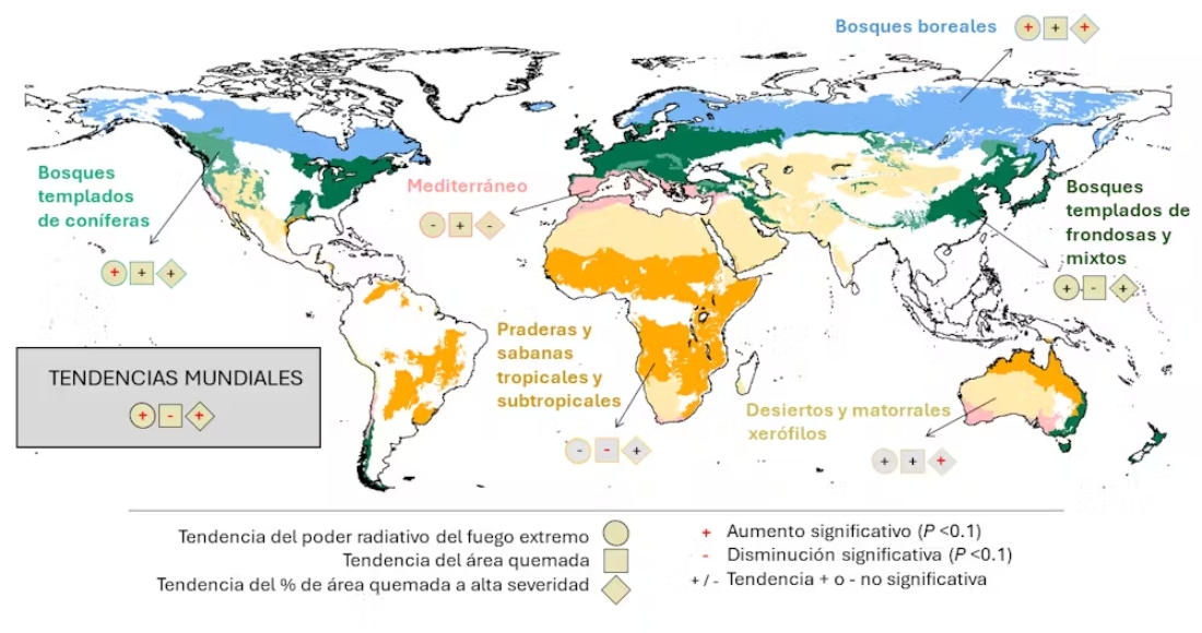El panorama actual de incendios no es halagüeño; sin embargo, existen diferencias importantes entre regiones. Este nuevo estudio identifica las zonas de bosques boreales y de bosques templados de coníferas (azul y verde en el mapa) como responsables principales del aumento mundial de los incendios extremos. Son estos bosques los que registran el mayor número de incendios extremos, en relación con la extensión que ocupan. Son también los que muestran el empeoramiento más drástico con el tiempo. Además, sufren un aumento de la superficie total quemada y del porcentaje quemado de alta severidad.