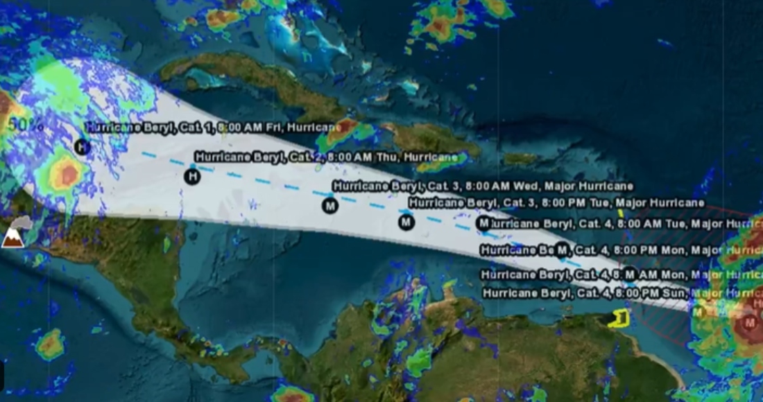 Había una alerta por huracán activa para Jamaica y las islas Gran Caimán, Pequeña Caimán y Caimán Brac. Se estima que "Beryl" se debilitará ligeramente en los próximos días, pero seguirá teniendo fuerza de huracán de categoría 3 o mayor a su paso cerca o sobre Jamaica el miércoles, cerca de las Islas Caimán el jueves y de la Península del Yucatán, en México, el viernes, según el Centro Nacional de Huracanes de Estados Unidos (NHC. por sus siglas en inglés).