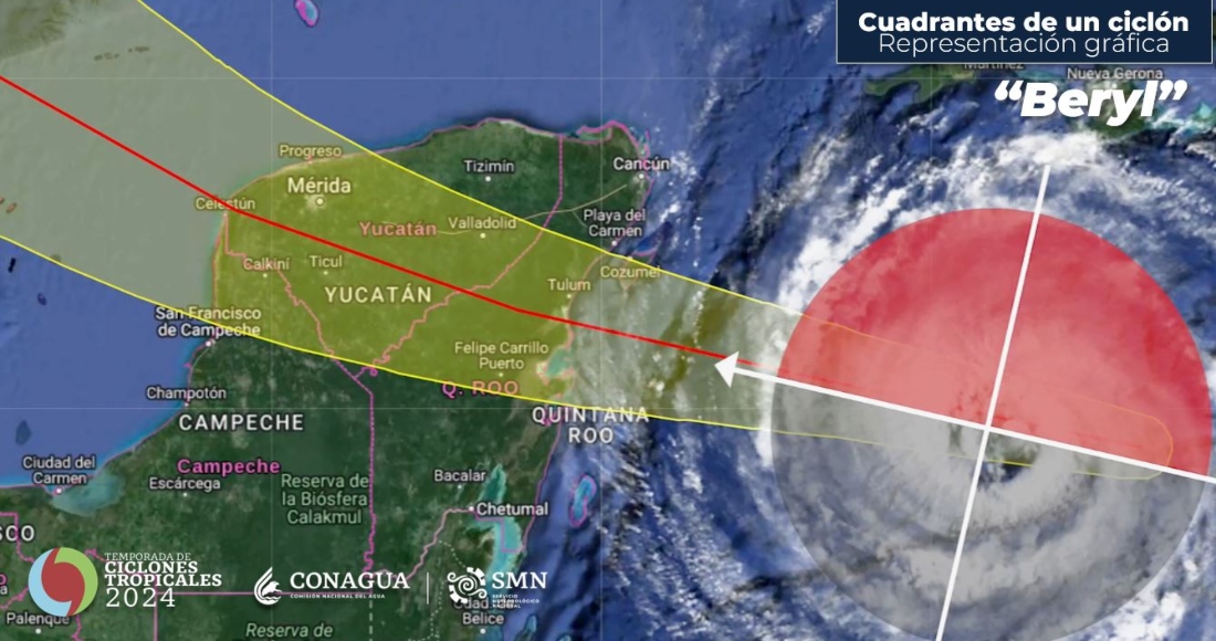 “Las bandas nubosas de ‘Beryl’ ocasionarán lluvias puntuales torrenciales (150 a 250 mm) en Yucatán y Quintana Roo; lluvias puntuales intensas (75 a 150 mm) en Campeche; lluvias puntuales muy fuertes (50 a 75 mm) en Tabasco y Chiapas; así como rachas de viento de 120 a 140 km/h y oleaje de cuatro a seis metros de altura en las costas de Yucatán y Quintana Roo”, se lee en el Aviso de Ciclón Tropical en el Océano Atlántico.