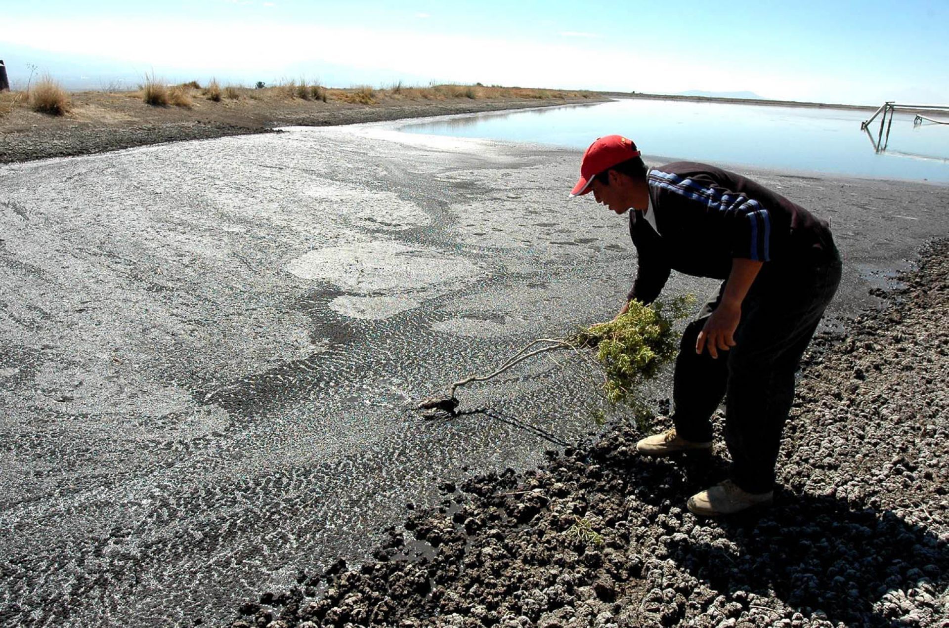 En esta imagen tomada en 2006 en las orillas de Granjas Carroll se observa el foco de contaminación que representa la laguna de oxidación próxima a la comunidad de Orilla del Monte, donde se vierten los desechos de las granjas que se secan al aire libre. Foto: Sergio Hernández, Cuartoscuro.