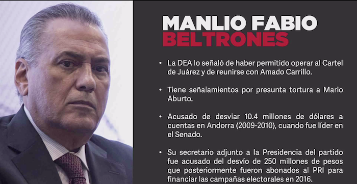 Y añadió: "¿Saben cuánto daño nos hizo eso con la sociedad mexicana a lo largo del tiempo? Y claro está, uno de los señalados en los expedientes, y no lo digo yo, lo dice la actuación judicial, es Manlio Fabio Beltrones. Y está mencionado ahí. Y todo lo que sale aquí es público y no vamos a permitir que vengan aquí a asustar".