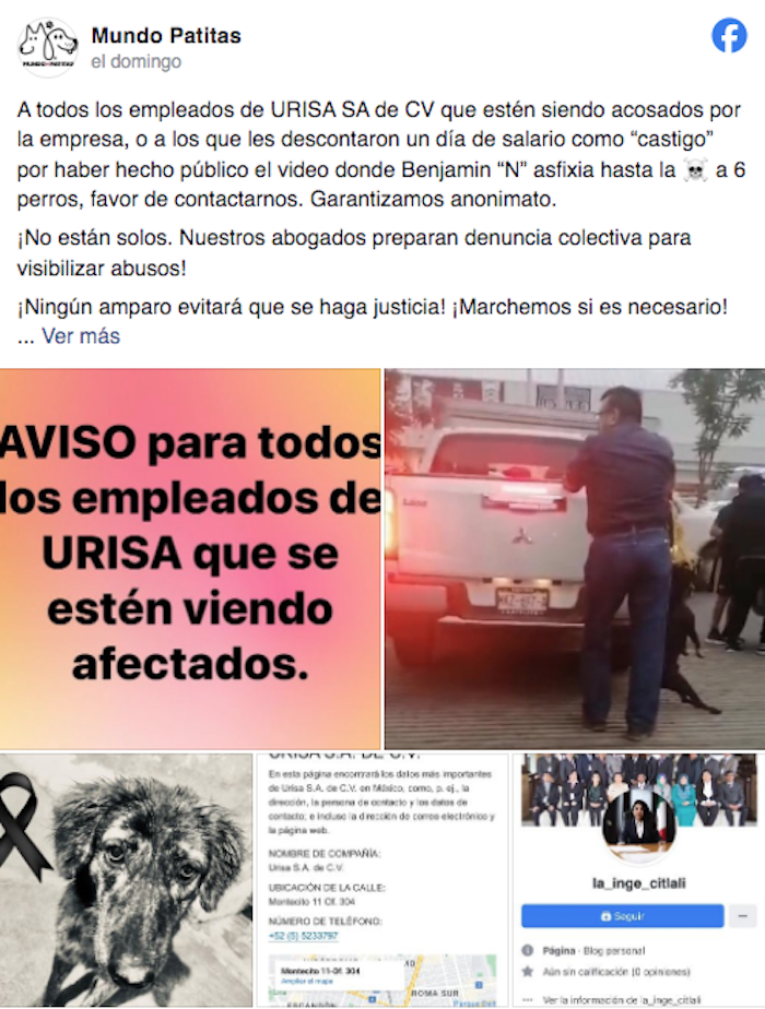 Por ello, la asociación emitió un llamado a los empleados de Urisa para sumarse a una denuncia colectiva en contra de esa empresa, la cual presuntamente estaría castigando a sus empleados por hacer públicos los casos de maltrato animal. “¡No están solos. Nuestros abogados preparan denuncia colectiva para visibilizar abusos! ¡Ningún amparo evitará que se haga justicia! ¡Marchemos si es necesario!”, señala el mensaje de la organización.