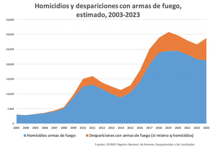 “La violencia armada en México ha aumentado precipitadamente en las últimas dos décadas desde que en 2004 expiró la prohibición federal de venta de armas de asalto en Estados Unidos y la declaración en 2007 de la guerra contra las drogas del Gobierno de México, con apoyo de Estados Unidos”, se lee en el reporte en el cual se muestran datos que dan cuenta cómo los homicidios y desapariciones perpetradas con armas de fuego entre 2003 y 2023 tuvieron su punto de quiebre precisamente en 2007, durante el Gobierno de Felipe Calderón Hinojosa (2006-2012).