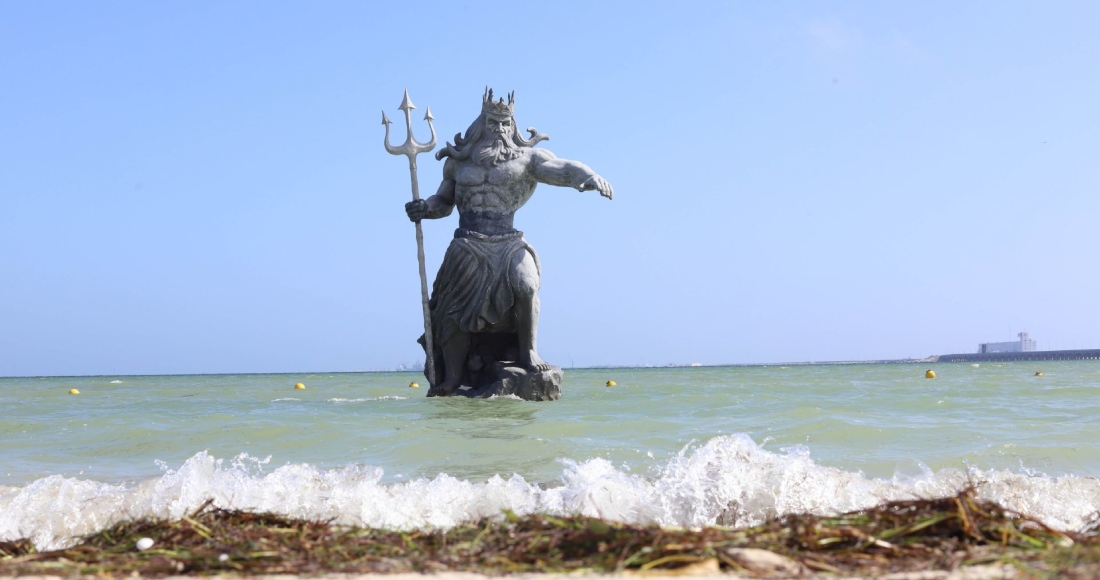 CIUDAD DE MÉXICO (AP).— La estatua del dios griego Poseidón, situada en una playa al sur del Golfo de México, tiene problemas de adaptación en tierras mayas.