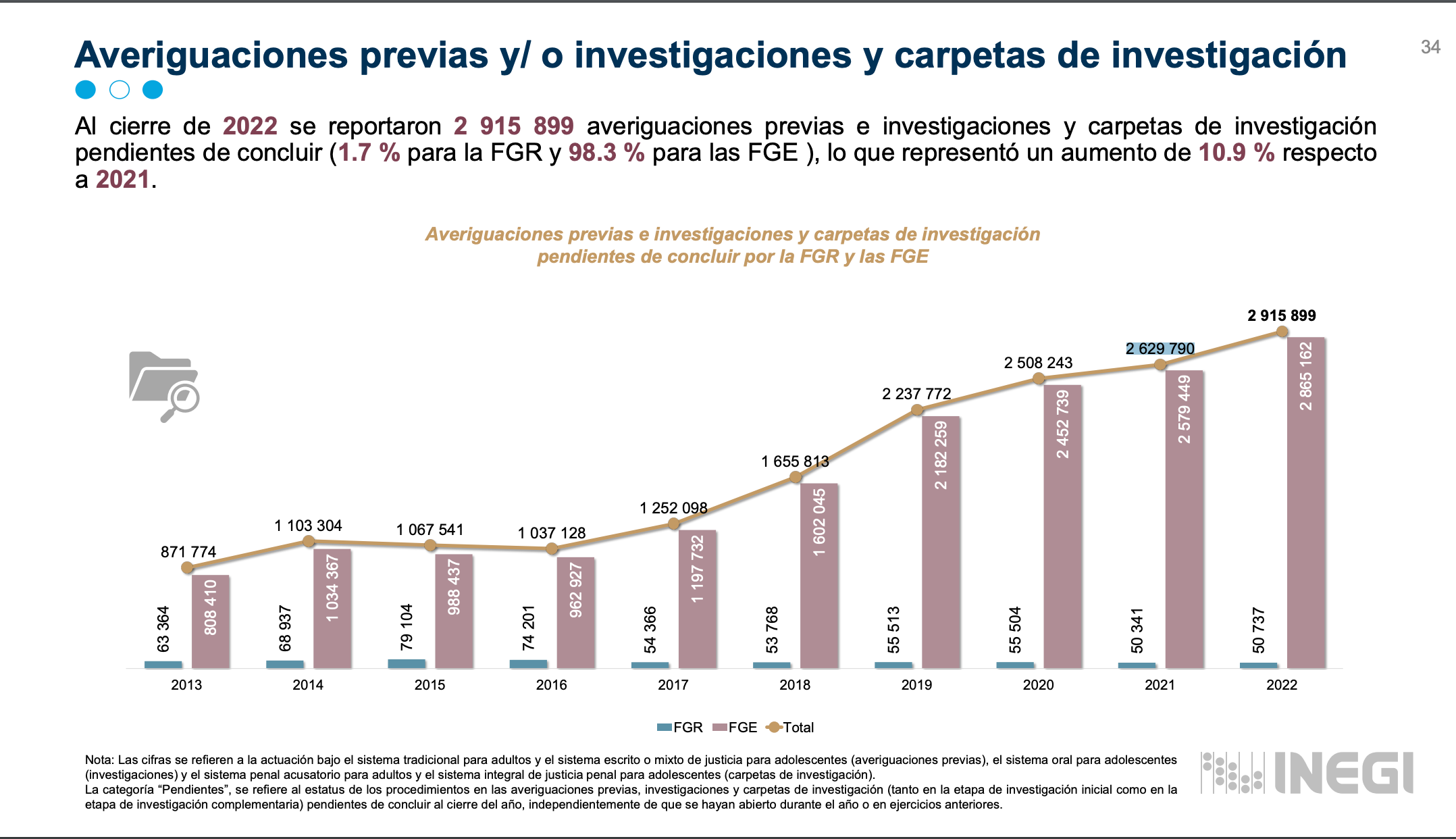 De acuerdo con la encuesta, en el año 2022 se iniciaron 2 millones 165 mil 791 carpetas de investigación y averiguaciones previas (el 3.6 por ciento a la Fiscalía General de la República (FGR) y el 96.4 por ciento a las Fiscalías Generales de los Estados (FGE)). Estas cifras representan un aumento del 5.1 por ciento con respecto a 2021, mientras que en el mismo periodo quedaron sin concluir 2 millones 629 mil 790 carpetas.