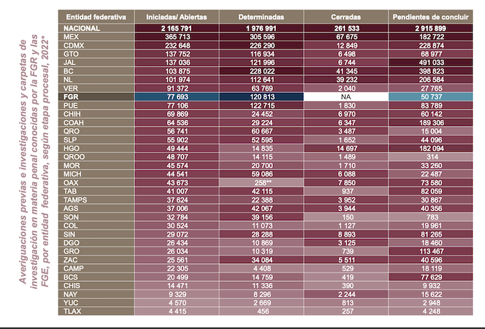 Los estados con mayor número de carpetas de investigaciones pendientes de concluir son Jalisco con 491 mil, Baja California con 398 mil, Ciudad de México con 228 mil, Nuevo León con 206 mil e Hidalgo con 182 mil.