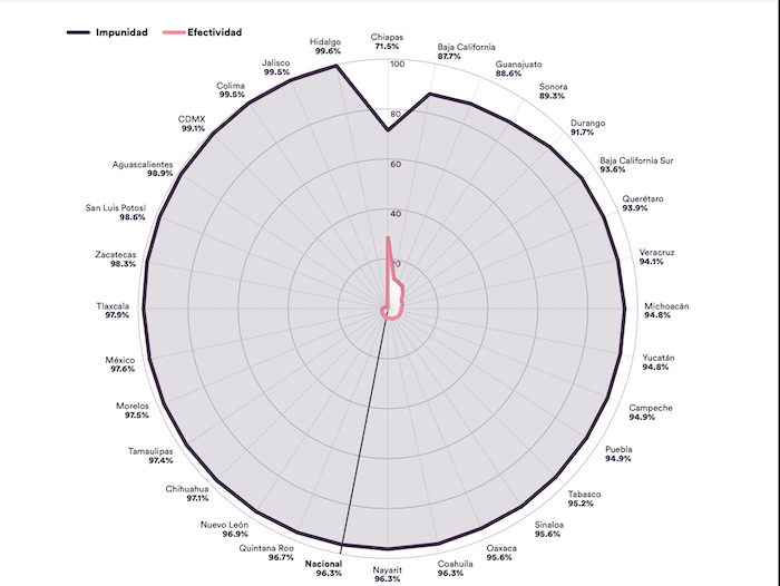 Al menos 28 entidades, de acuerdo con el informe, presentan niveles de impunidad superiores al 90 por ciento, siendo los estados con los mayores índices de impunidad Hidalgo con el 99.6 por ciento, Jalisco con el 99.5 por ciento, Colima con el 99.5 por ciento y la Ciudad de México con el 99.1 por ciento.