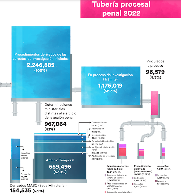 De acuerdo con el estudio, de las 2 millones 300 mil denuncias y querellas recibidas por el Ministerio Público en 2022, el 87.9 por ciento resultó en la apertura de una carpeta de investigación, cifra que representa una disminución de cuatro puntos respecto al año anterior.
