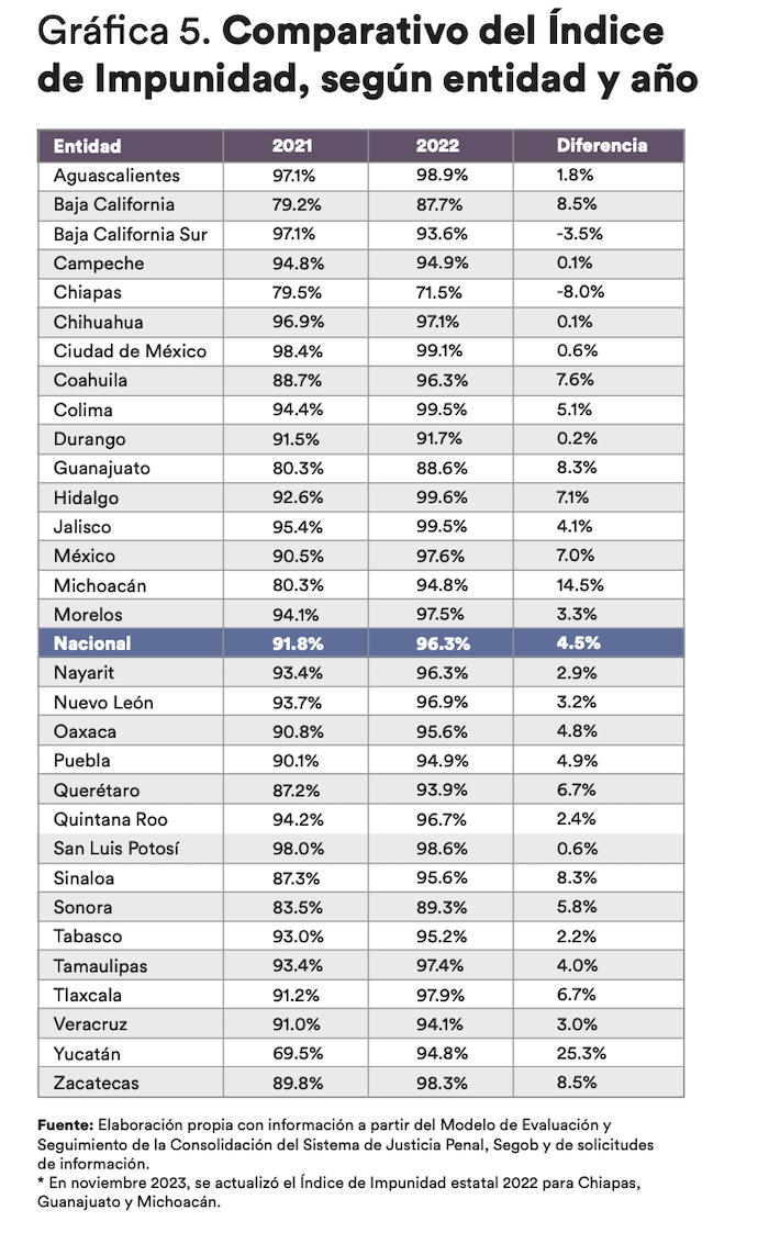 Al respecto, el Índice de Impunidad para 2022 mostró a nivel nacional un incremento de 4.5 puntos porcentuales respecto al año anterior, alcanzando una media nacional del 96.3 por ciento, en comparación con el 91.8 por ciento registrado en 2021.