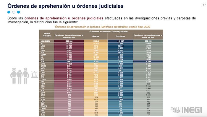 En México a nivel nacional, se inició el año 2022 con un total de 333 mil 664 órdenes de aprehensión pendientes de cumplimentarse, de acuerdo con el censo del Inegi. Durante el año, se giraron 124 mil 240 nuevas órdenes, acumulando un total de 457 mil 904. Al cierre del año, quedaron 332 mil 299 órdenes pendientes.
