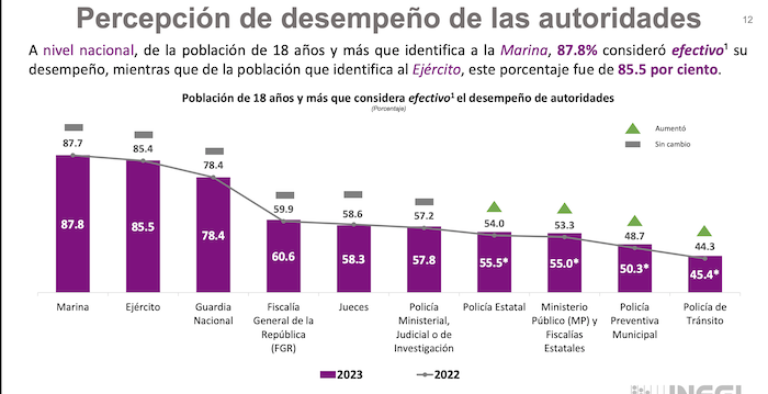 En relación con la percepción que tienen los mexicanos sobre el desempeño de las autoridades, la Encuesta Nacional de Victimización y Percepción sobre Seguridad Pública (ENVIPE) 2023 señala que la Marina es la institución que la población considera más efectiva, con un 87.8 por ciento de aprobación.