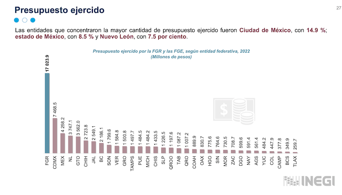 La FGR ejerció un presupuesto de 17 mil 23 millones 887 mil 648.4 pesos, mientras que las FGE ejercieron 50 mil 170 millones 441 mil 890.7 pesos, un aumento del 2.2 por ciento y 1.2 por ciento respectivamente respecto a 2021. Las entidades con mayor presupuesto fueron Ciudad de México con el 14.9 por ciento, Estado de México con el 8.5 por ciento y Nuevo León con el 7.5 por ciento.