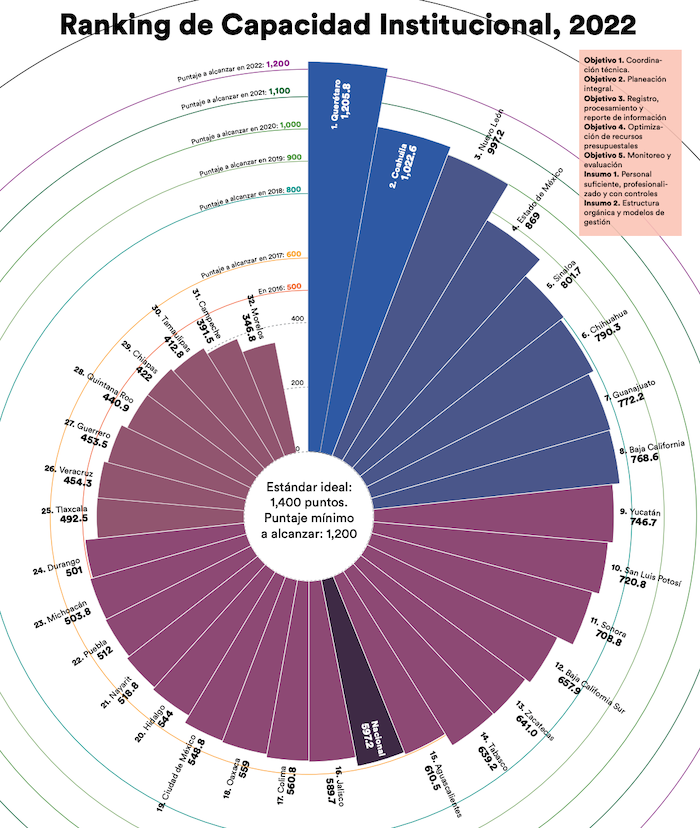 No obstante, el estudio también clasificó a las entidades según su capacidad institucional para responder a las demandas del Sistema de Justicia Penal. La calificación, según se explicó, se basa en un puntaje donde el estándar ideal es de 1,400 puntos y un mínimo alcanzable de 1,200. Para ello, la organización indica que se evaluaron criterios como la planificación, coordinación, presupuestación y evaluación, así como la capacidad instalada en términos de personal, infraestructura y organización interna.