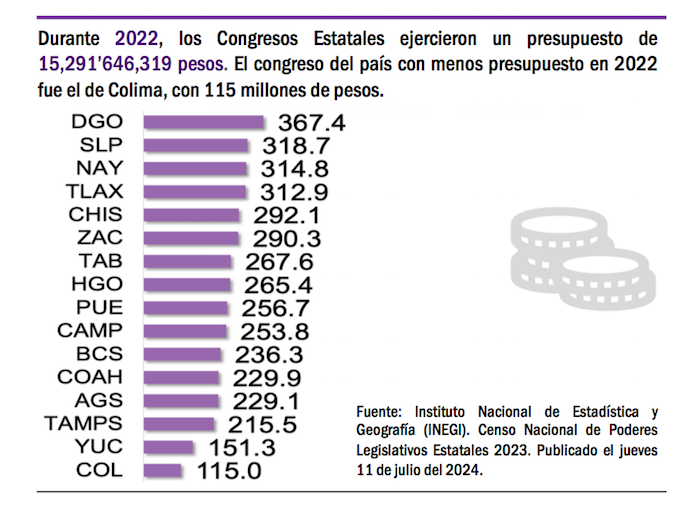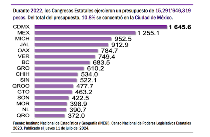 El Censo del INEGI sobre los congresos estatales puntualiza que los dos congresos estatales más caros del país, los que que representan un gasto de más de mil millones de pesos anuales, son los de la Ciudad de México y el del Estado de México. Y en contraste, los congresos que menos presupuesto de egresos tienen son Yucatán y Colima.