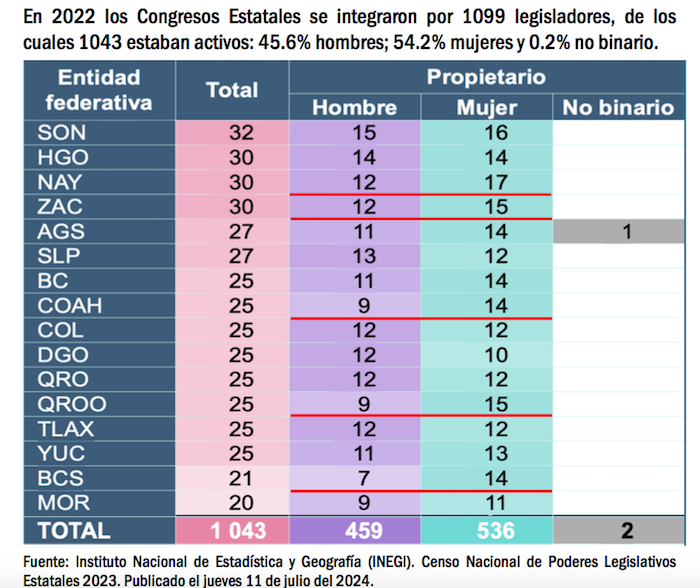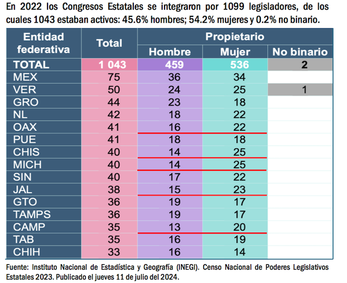 De acuerdo con los números del Censo Legislativo elaborado por el INEGI, en el país había en el 2022 un total de 459 diputados varones, por 536 mujeres, una mayoría aplastante en los congresos estatales.