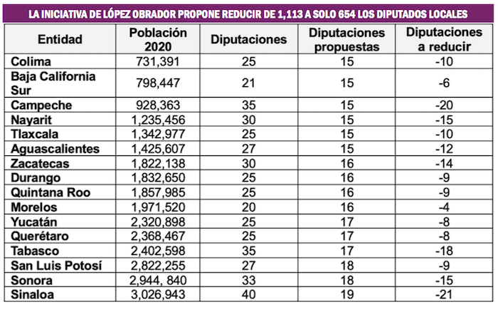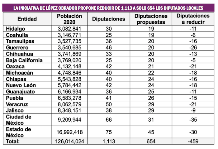 Estos datos le dan mucho sentido a la iniciativa de reformas constitucionales en materia electoral promovida por el Presidente Andrés Manuel López Obrador, que propone una reducción del 41 por ciento en la integración de los congresos estatales, con la eliminación de los diputados de Representación Proporcional.