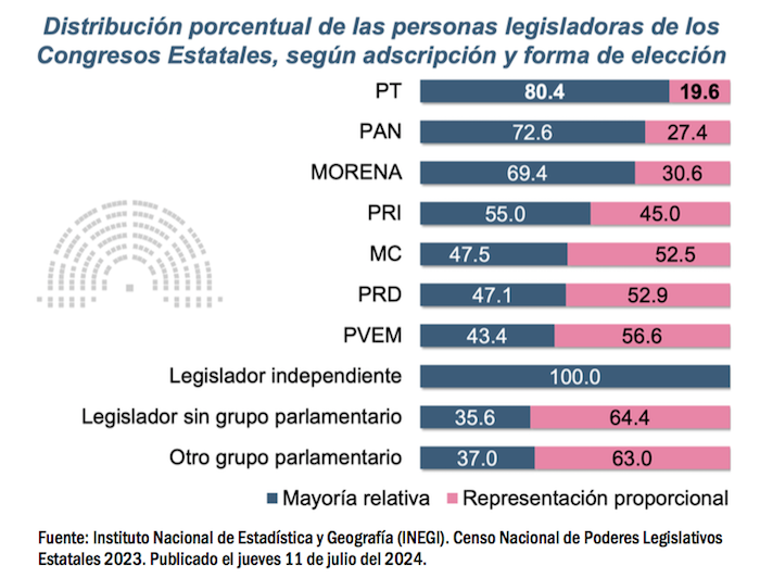 El estudio también concluye que el porcentaje mayor de diputados locales que tienen partidos como Movimiento Ciudadano, de la Revolución Democrática y Verde Ecologista de México son predominantemente de Representación Proporcional, legisladores por los cuales los ciudadanos no votan directamente.