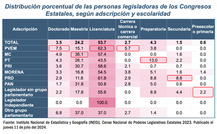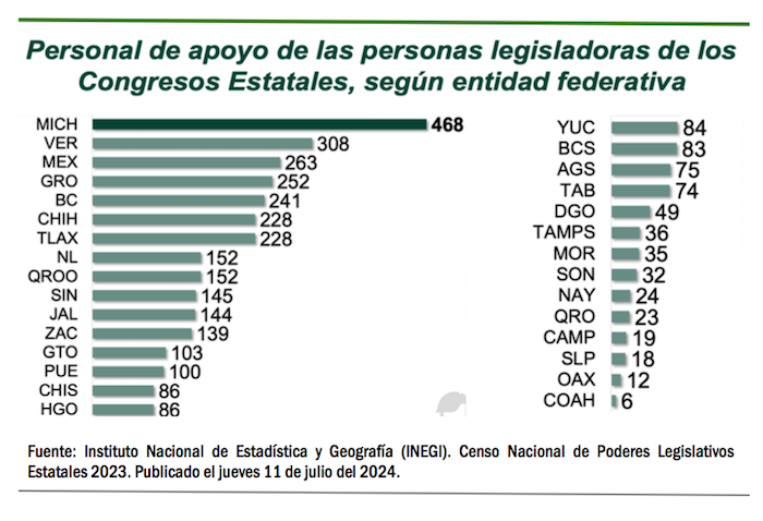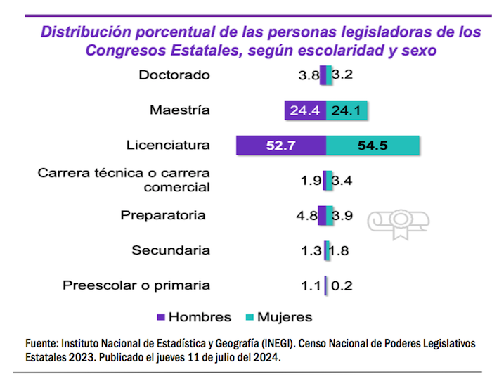 El Censo Nacional de Poderes Legislativos Estatales 2023, publicado por el INEGI el jueves 11 de julio del 2024 también analiza la preparación académica de los diputados locales, sus salarios y el personal de apoyo con el que cuentan. Más de la mitad de los legisladores de los congresos estatales tienen grado académico de licenciatura. Y en general, los salarios en el Poder Legislativo son muy generosos.