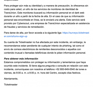 “Le recomendamos que se mantenga alerta y tome medidas para protegerse contra el robo de identidad y fraude como monitorear sus cuentas, estados de cuenta e informes de crédito gratuitos a fin de detectar indicios de actividades sospechosas”, se lee en el mensaje de Ticketmaster.