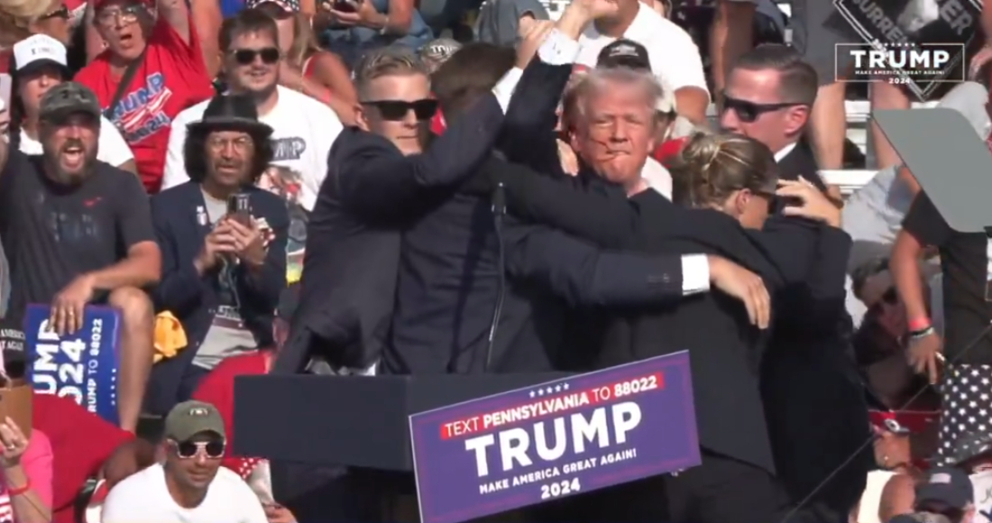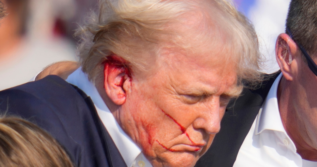 Unos instantes más tarde, Trump se levantó mientras los agentes del Servicio Secreto le rodeaban y cubrían su cuerpo con los suyos. Intentaron llevarse al expresidente del escenario por su izquierda mientras le goteaba sangre de la oreja. Antes, Trump alzó el puño.