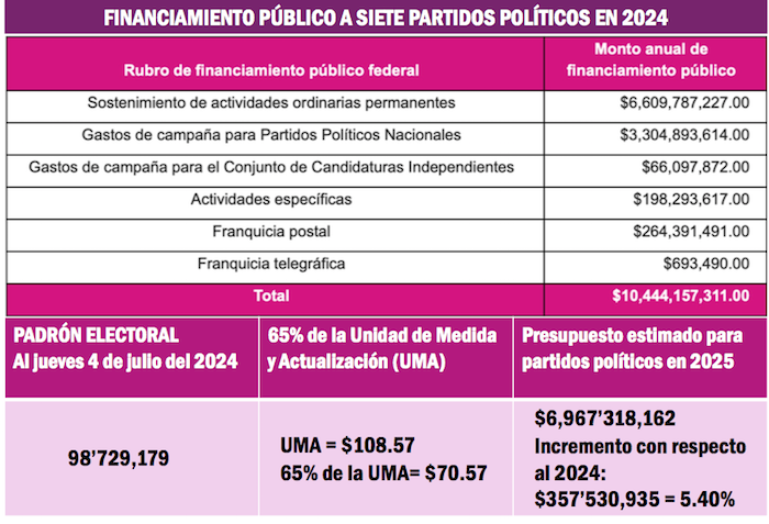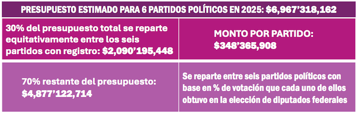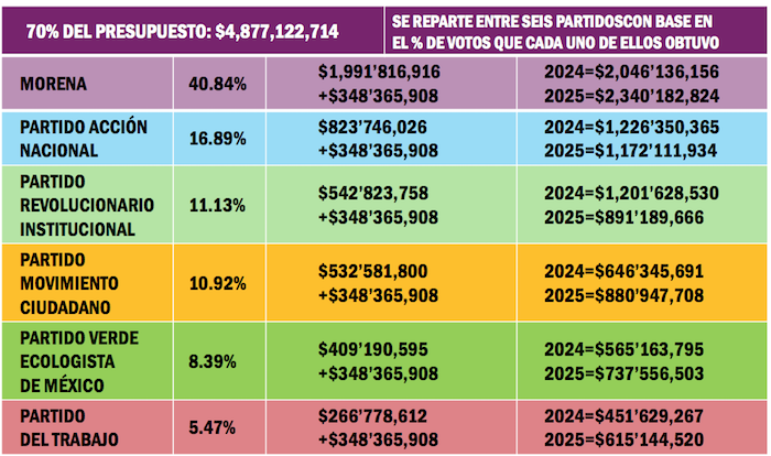 Ciudad de México, 15 de julio (SinEmbargo).– Seguirá el despilfarro con el dinero de los contribuyentes: en 2025, aunque no será un año en el que se vayan a realizar elecciones y pese a que en lugar de siete partidos políticos con registro oficial habrá solamente seis, el financiamiento público a esas organizaciones presuntamente de ciudadanos, aumentará en más de 350 millones de pesos, si calculamos con base en la fórmula establecida en el artículo 41 de la Constitución de la República, para determinar ese subsidio.