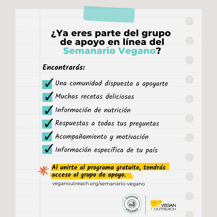 ¡Únete al Semanario Vegano de Vegan Outreach! Este es un reto guiado en línea en donde recibirás vía correo electrónico información de nutrición, recetas, recomendaciones de productos, acceso a un grupo de apoyo, consejos prácticos, información sobre los animales a los que estarás ayudando y herramientas para hacer de este un camino más sencillo. Más de 1.4 millones de personas se han unido y lo mejor de todo: ¡es gratis!