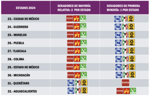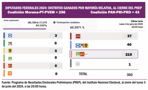 Aún sin considerar el reparto de las 200 diputaciones de Representación Proporcional, conocidas genéricamente como plurinominales y las 32 senadurías de lista nacional, también consideradas como escaños de Representación Proporcional, las victorias de Mayoría Relativa de Morena-PT-PVEM, le dan a la coalición gubernamental una clara Mayoría Calificada, al obtener más de los dos tercios de posiciones que estuvieron en disputa para el Poder Legislativo en los comicios del domingo 2 de junio del 2024.