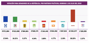 En junio pasado se disputaron 96 senadurías, 64 de Mayoría Relativa y 32 de Primera Minoría, es decir las acreditadas a los partidos que quedaron en segundo lugar en las 32 entidades del país. Morena y sus aliados, Partido del Trabajo y Partido Verde Ecologista de México obtuvieron, de entrada, 60 posiciones de Mayoría Relativa al vencer a sus rivales en 30 estados de la República. Y sumaron además cinco senadurías de Primera Minoría. Incluso, la coalición morenista le arrebató a la coalición encabezada por el PAN las dos senadurías de Mayoría Relativa en entidades conservadoras como Guanajuato y Yucatán. Además, la coalición morenista sumó cinco senadurías de Primera Minoría (segundo lugar) para llegar a 65 de los escaños que se consiguen con el voto directo de los ciudadanos.