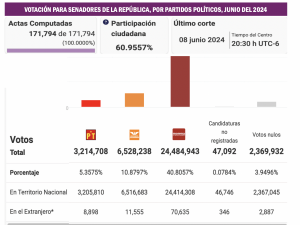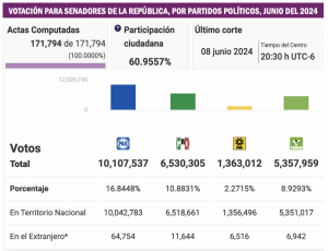 Por otra parte, Morena sumó en el 2018 el 38.25 por ciento de los votos para el Senado de la República y en 2024 aumentó a 40.80 por ciento; el Partido Verde Ecologista de México tuvo en el 2018 el 4.54 por ciento y en el 2024 sumó el 8.92 por ciento, en tanto que el Partido del Ttrabajo logró en 2018 el 3.89 por ciento y en el 2024 llegó al 5.35 por ciento.