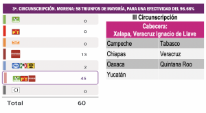 Hubo casos verdaderamente dramáticos en la elección de diputados federales de Mayoría Relativa, como ocurrió en la Tercera Circunscripción Electoral, donde la derrota de la oposición fue casi total, pues de 60 distritos de Mayoría Relativa la coalición PAN-PRI-PRD apenas ganó dos: el distrito 4, en Boca del Río, Veracruz, con María Josefina Gamboa Torales y el 4 de Mérida, Yucatán, con María Isabel Rodríguez Heredia. La coalición Morena-PT-PVEM ganó 58 de 60 curules de Mayoría Relativa, para un porcentaje de efectividad del 96.66 por ciento.