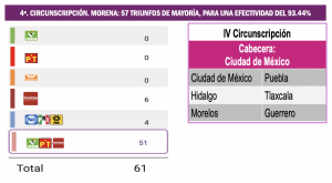 También en la Cuarta Circunscripción Electoral la oposición fue prácticamente borrada del mapa, pues la coalición encabezada por el PAN logró sólo 4 victorias, todas en Ciudad de México, frente a 57 triunfos de 61 posibles que se adjudicó la coalición Morena-PT-PVEM, para un porcentaje de efectividad electoral del 93.44 por ciento.