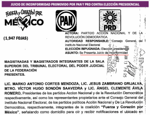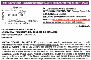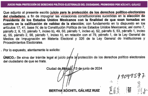 También se reclama, entre los agravios principales, la intervención de Arturo Zaldívar Lelo de Larrea, en su calidad de ministro de la Suprema Corte de Justicia de la nación, a favor de Claudia Sheinbaum Pardo. Igual se denuncia el presunto uso indebido del Centro Nacional de Inteligencia para ejercer violencia electoral en contra de Xóchitl Gálvez; la supuesta coacción del voto de la ciudadanía; el uso indebido de programas sociales durante el proceso electoral para coaccionar y comprar el voto de la ciudadanía, así como la violencia generalizada y la intervención del crimen organizado durante el desarrollo del proceso electoral.
