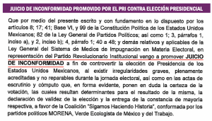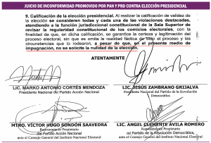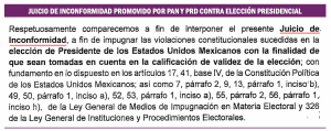 Los agravios que argumenta la oposición en contra del resultado de las elecciones son los mismos en las tres impugnaciones presentadas: 1.- Violaciones graves, sistemáticas y reiteradas de los principios de imparcialidad, neutralidad y equidad en la contienda previstos en el artículo 134 de la Constitución federal. I.- Intervención sistemática y reiterada del Ejecutivo Federal. II.- Intervención sistemática y reiterada de los titulares de los Ejecutivos locales en la elección presidencial y III.- Intervención sistemática y reiterada de órganos de Estado, servidores públicos y actores políticos relevantes en la elección presidencial.