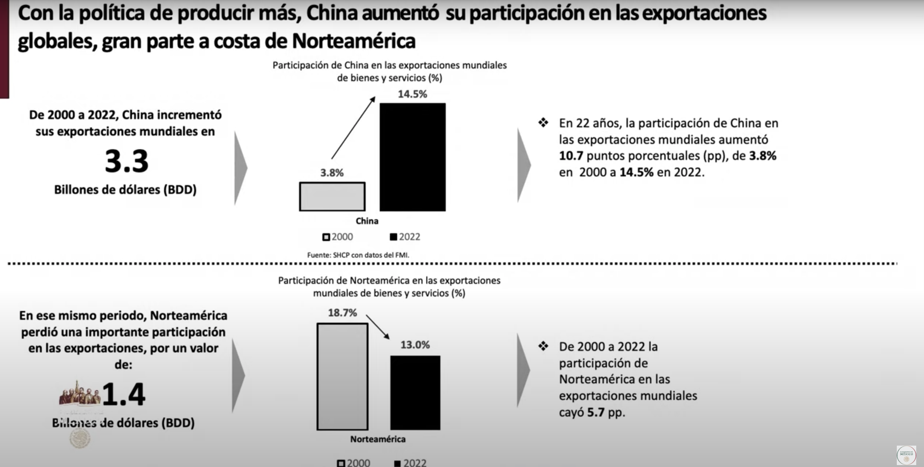 Desde San Luis Potosí, el Secretario recordó que con la política de producir más, China aumentó su participación en las exportaciones globales a costa de Norteamérica. “En 2020 el Gobierno de Estados Unidos fue el que le facilitó la entrada a la Organización Mundial de Comercio (OMC) y esto abrió a China la puerta para incrementar su producción en Norteamérica, incluyendo México”.
